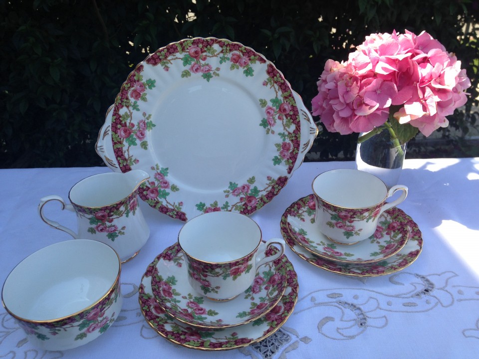 Gorgeous red and pink floral china. Beautiful tea set for a springtime English tea party.